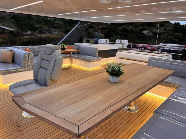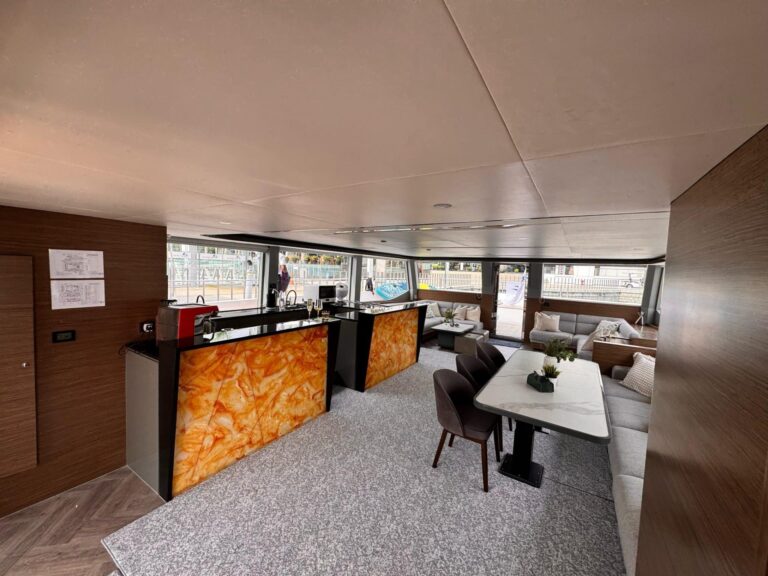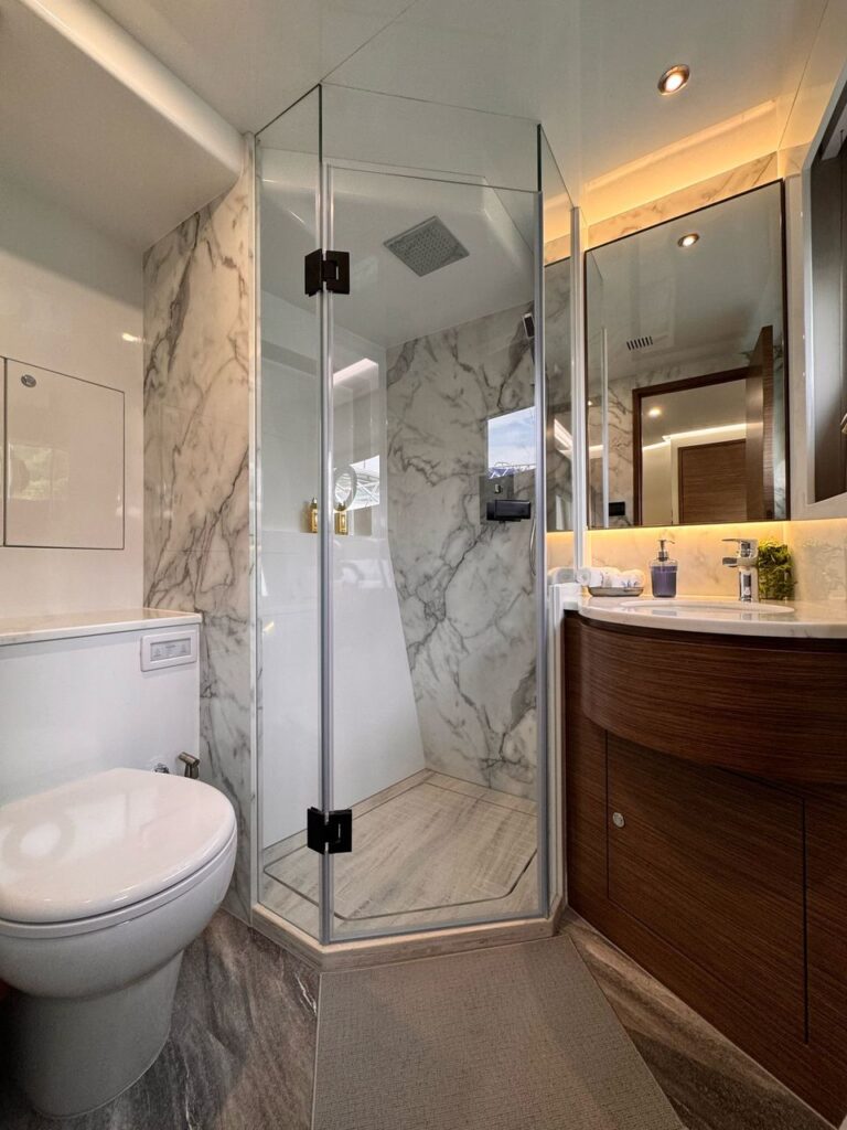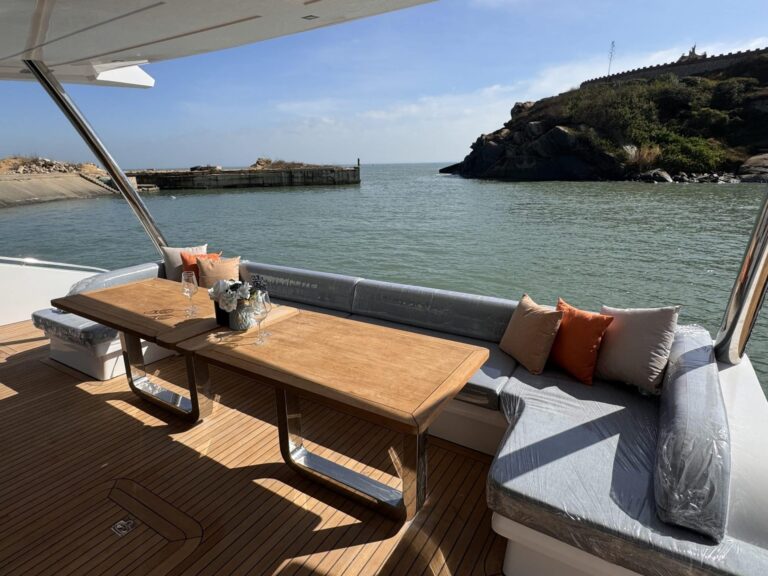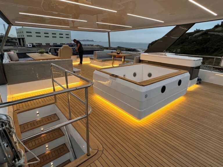 This modern and stylish yacht is fully equipped to meet all your hosting needs. Step aboard and you’ll find a jacuzzi perfect for relaxing under the sun or stars, a karaoke system to get the party started, and beautifully designed interiors that offer both elegance and space.